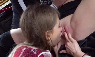 Naughty lesbian Sonia gives tongue job to her lezzy girlfriend in the car
