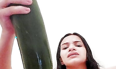 Brazilian teen College-aged+, fucks her vag deep with a big cucumber, and creams her hot pussy!